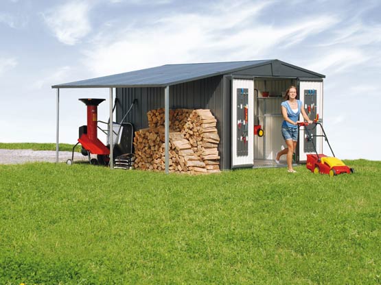 Acoperiş lateral suplimentar: cu ajutorul acestuia poţi extinde spaţiul de depozitare disponibil. Se poate ataşa pe partea dreaptă, pe partea stângă sau pe ambele părţi ale casei de grădină. Setul include şi toate părţile de prindere şi accesoriile necesare instalării. (Nu este disponibil pentru casele de dimensiunea 1 şi 2A).
